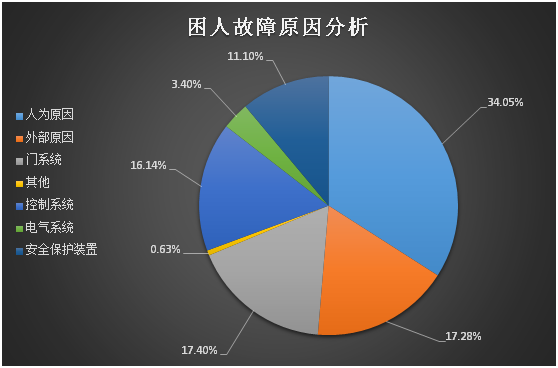依据《电梯应急处置平台技术规范》(CPASE M001—2019),在人为原因、外部原因、门系统、曳引系统、导向系统、轿厢、控制系统、电气系统、安全保护装置九类故障中:人为原因故障(270起,占34.05%)、外部原因故障(137起,占17.28%)、门系统故障(138起,占17.40%)居前三位,其中生活(装修)垃圾导致开关门受阻困人227起、停电困人66起、门锁失效90起。