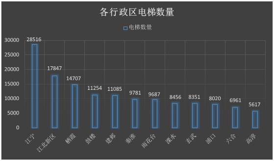 亚洲色吧 12个行政区在用电梯分布情况如下,其中江宁区电梯数量最多28516台;高淳区电梯数量最少5617台。