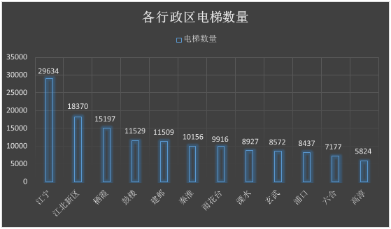 亚洲色吧 12个行政区在用电梯分布情况如下,其中江宁区电梯数量最多29634台;高淳区电梯数量最少5824台。