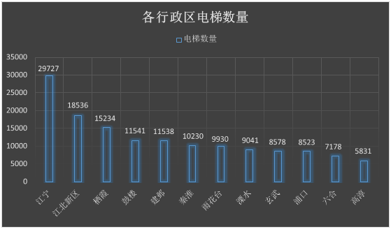 亚洲色吧 12个行政区在用电梯分布情况如下,其中江宁区电梯数量最多29727台;高淳区电梯数量最少5831台。