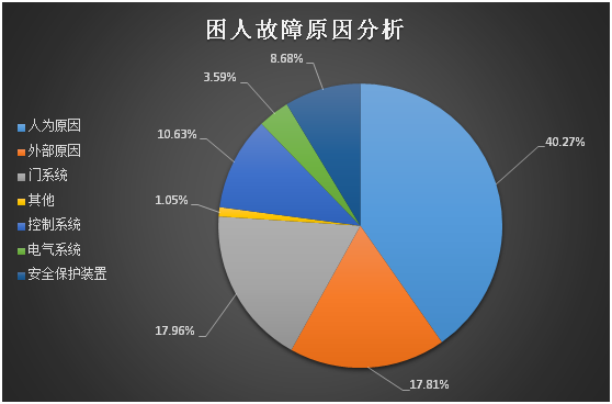 依据《电梯应急处置平台技术规范》(CPASE M001—2019),在人为原因、外部原因、门系统、曳引系统、导向系统、轿厢、控制系统、电气系统、安全保护装置九类故障中:人为原因故障(269起,占40.27%)、门系统故障(120起,占17.96%)、外部原因故障(119起,占17.81%)居前三位,其中生活(装修)垃圾导致开关门受阻困人220起、停电困人56起、门锁失效859起。