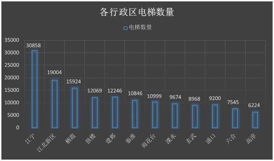 亚洲色吧 12个行政区在用电梯分布情况如下,其中江宁区电梯数量最多30858台;高淳区电梯数量最少6224台。